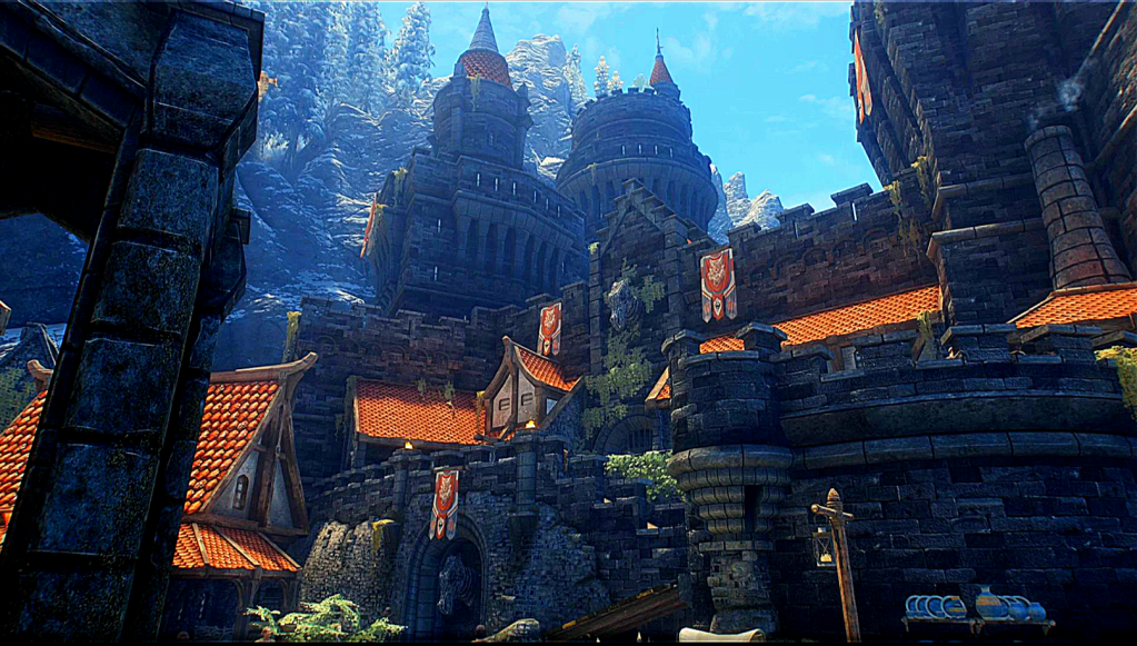 Turvion is built from thousands of stone towers filling the castle city in their mighty watch. Each one with splendid torchlight beacons blazing from inside the windows. They have cylinder shapes and conical rooves with flags of the great noble houses at their peaks. In the lower levels, its houses are all forged from chestnut brown wooden beams, and its streets are smooth cobblestone alive with the patter of horses drawing carriages.